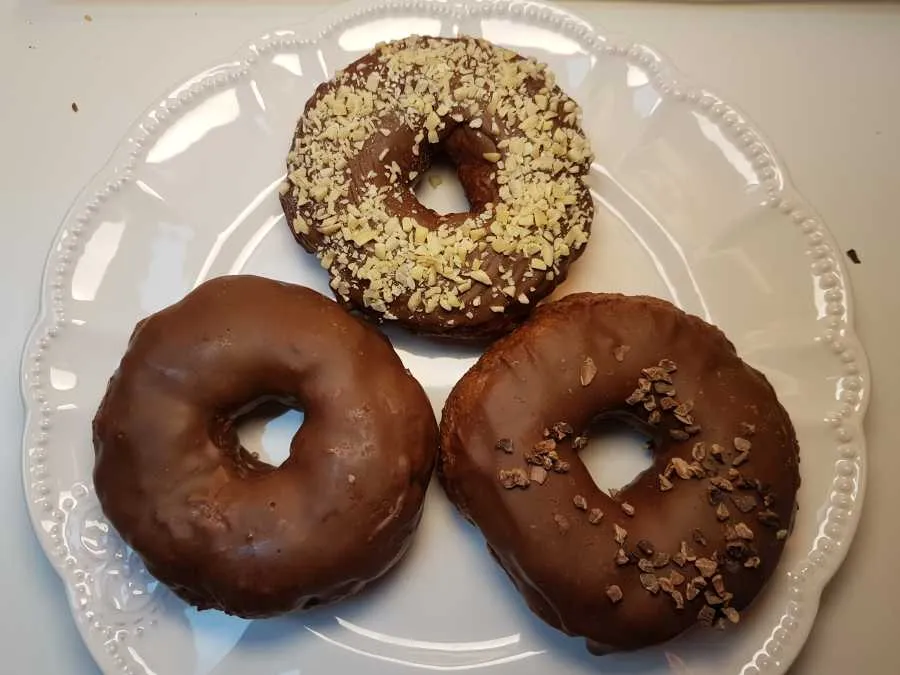 - Für die Nougatglasur alle Zutaten im Wasserbad schmelzen und auf unter 27 °C abkühlen lassen bzw. bis die Glasur ziemlich dickflüssig ist. Die Donuts entweder komplett in der Glasur wenden oder nur auf einer Seite mit einem Pinsel bestreichen. Anschließend nach Wunsch mit Kakaobohnensplitter oder gehackten Mandeln / Nüssen etc.. bestreuen und fest werden lassen.
