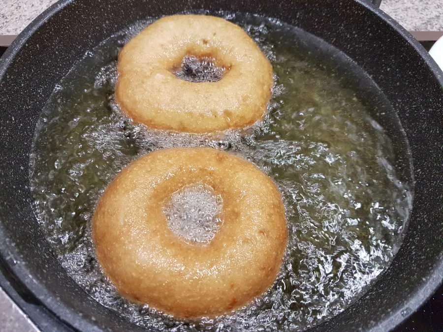 - Eine Pfanne (oder Fritteuse) mit Fett auf 160°C erhitzen (mind. 2 cm hoch in der Pfanne) und die Donuts ca. 8 Minuten frittieren, dabei mehrfach wenden. WICHTIG! Kontrolliere regelmäßig die Temperatur damit die Donuts nicht zu dunkel werden.