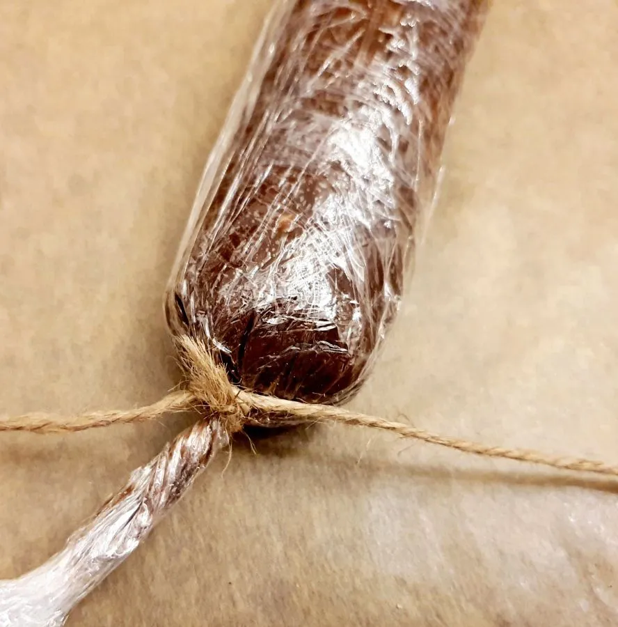 - Dann die Wurst in die Hand nehmen und von der zweiten Seite die Schokolademasse zum Ende streichen und die Folie am zweiten Rand drehen, bis die Schokoladenmasse gleichmäßig und ausgefüllt ist. Dann mit Garn das zweite Ende verschließen. Mit einer Frischhaltefolie auf Zug nochmal eindrehen, dann wird sie gleichmäßig ohne Löcher.