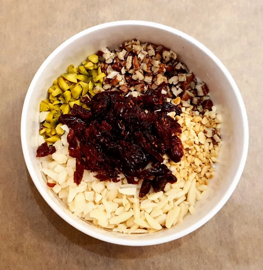 - Pistazien, Pekannüsse, Macadamia in Stücke hacken. In eine Schüssel füllen und getrocknete Pflaumen, Haselnüsse und Mandelstifte hinzufügen. Die Plätzen auch grob hacken und mit den Nüssen vermengen.