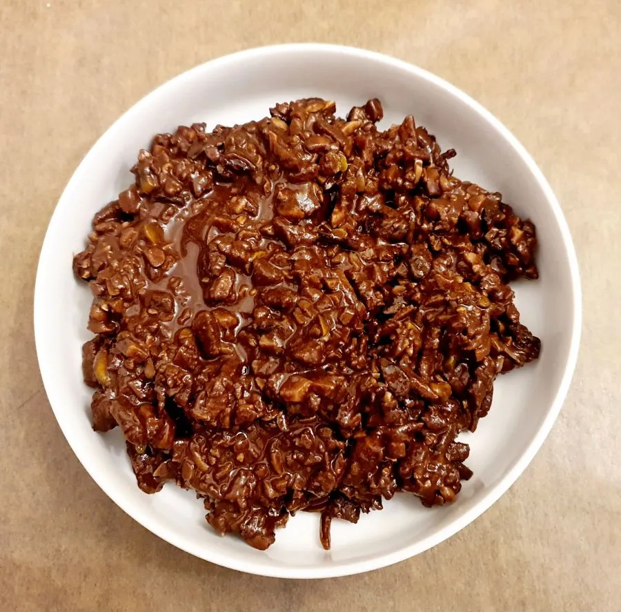 Salami aus Schokolade, Nüssen und Keksen. Pro 100g nur 5g Kohlenhydrate.
