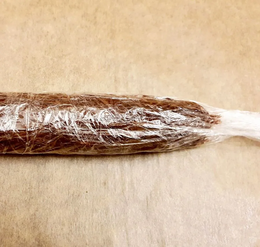- Das eine Ende mit der Folie drehen und mit Garn abbinden.