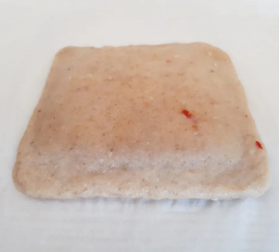- In der Mitte der ausgestochenen Quadrate Käse und Schinken auflegen, wobei der Schinken in der Mitte sein soll. Es muss unbedingt ein Teigrand bleiben, den mit Wasser bestreichen und zum Abschluss ein Teigquadrat auflegen. Mit feuchten Fingern den Rand zusammendrücken und glätten (siehe Foto). Der Rand muss sehr gut zusammengedrückt sein, sonst läuft der Käse aus. Ich hab einen Teil mit Speckwürfel gefüllt.
