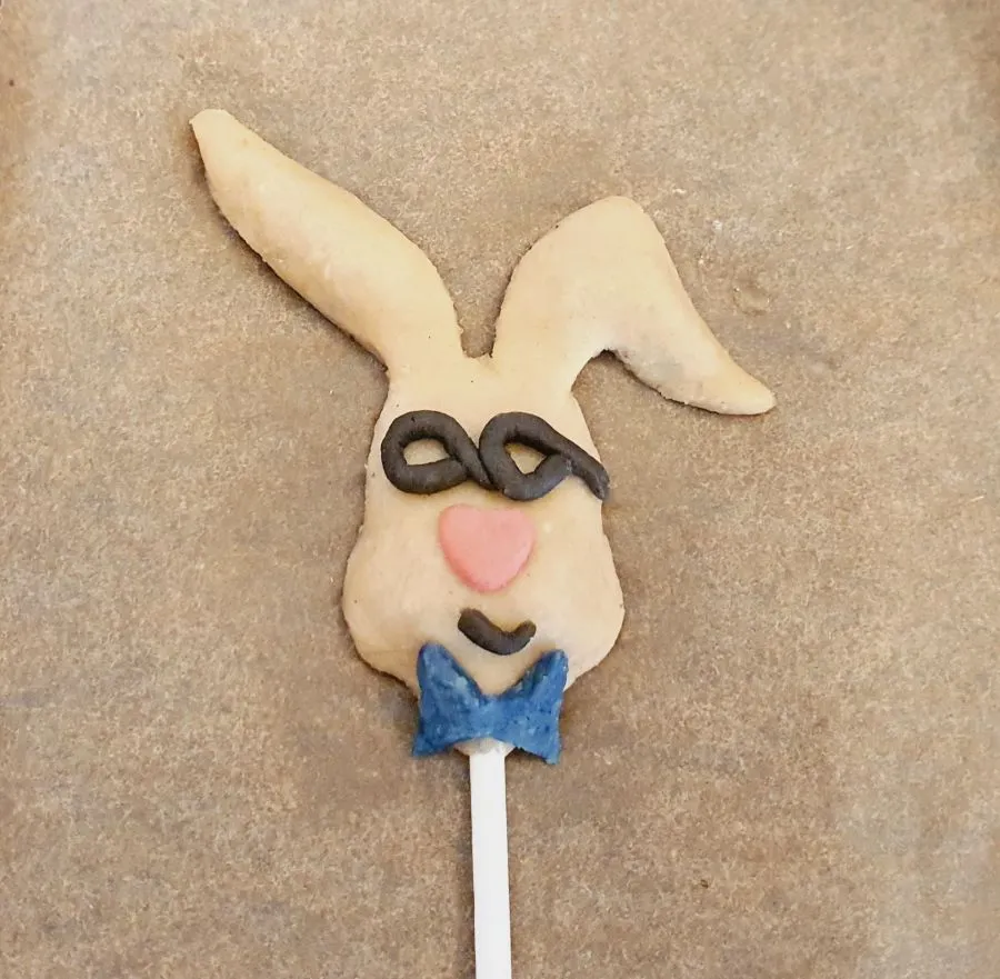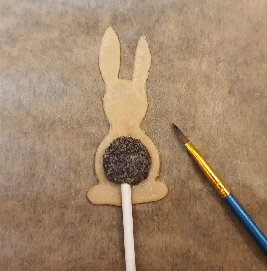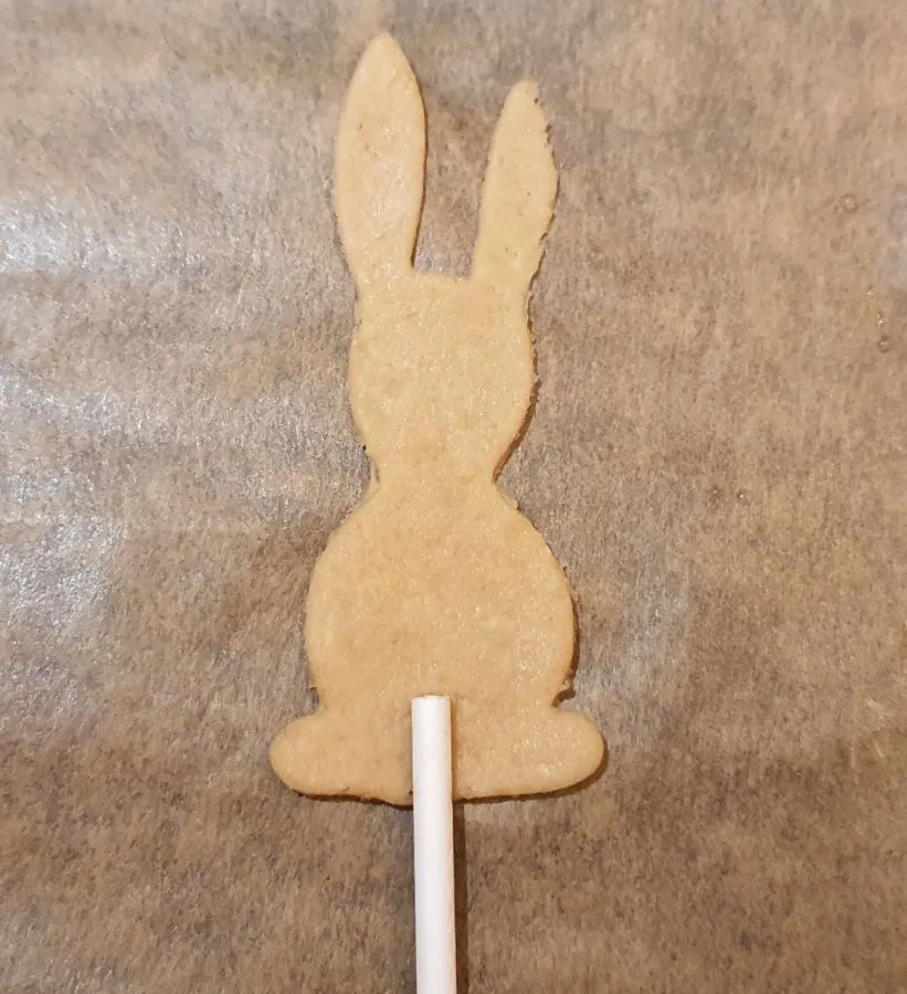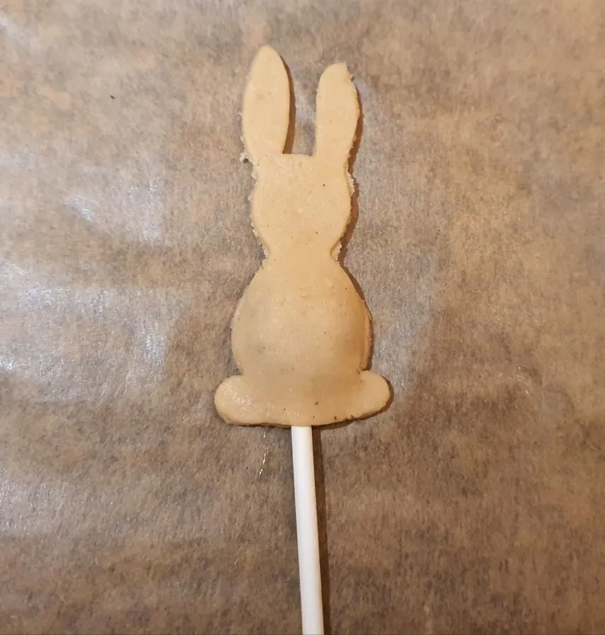 - 1 ausgestochenes Haserl auf ein Backpapier legen. Den Cakepop Stiel mittig drauflegen und etwas andrücken.