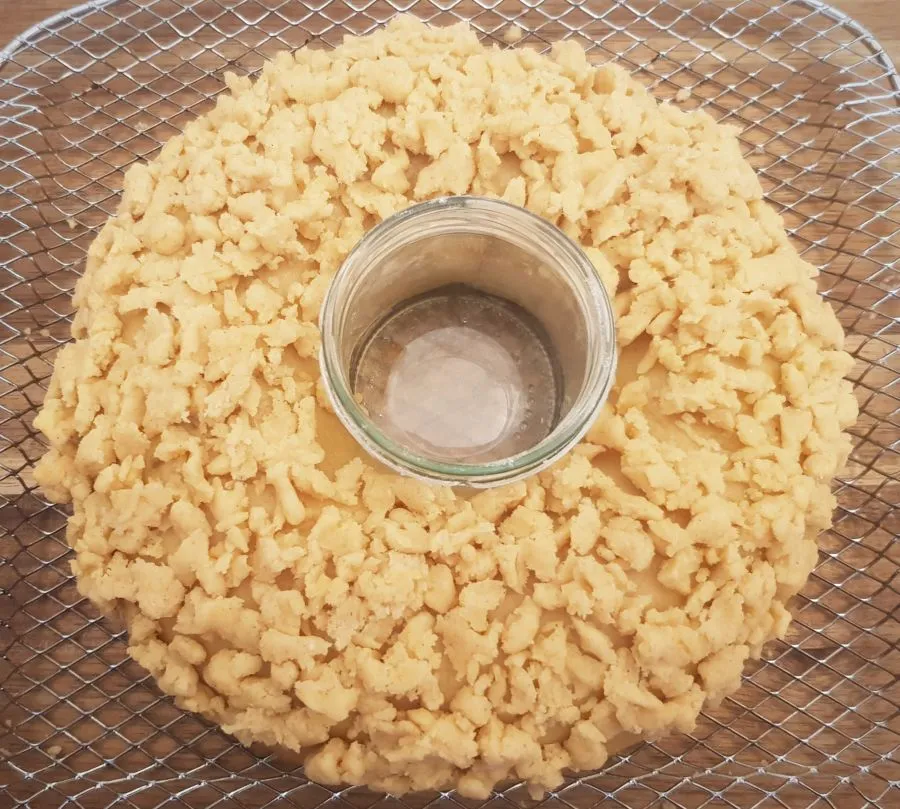 • Mit einem verquirltem Ei bestreichen und 2/3 des Streuselteiges Streusel auf dem Kranz verteilen. Den Rest vom Ei und den Streuselteig zur Seite stellen.