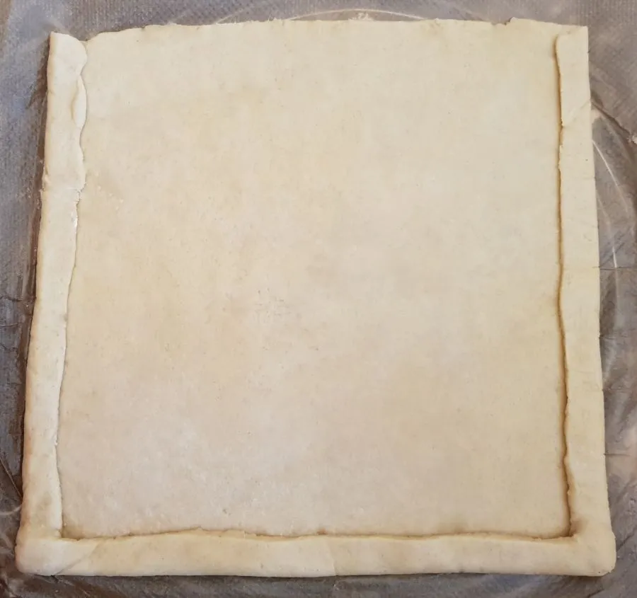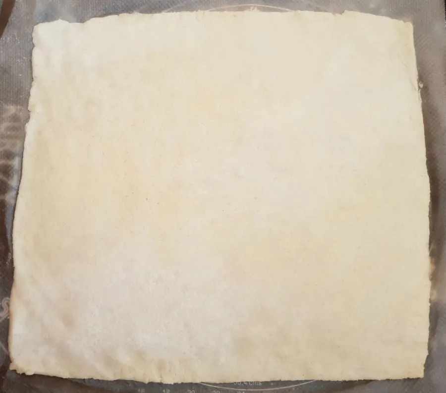 • Nach dem Ausrollen die Ränder links, rechts und unten mit Wasser benetzen und etwas einklappen