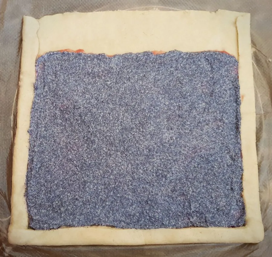• Mit Himbeermarmelade bestreichen - 1/5 des Teiges oben nicht bestreichen! Danach mit der Mohnmasse bestreichen.