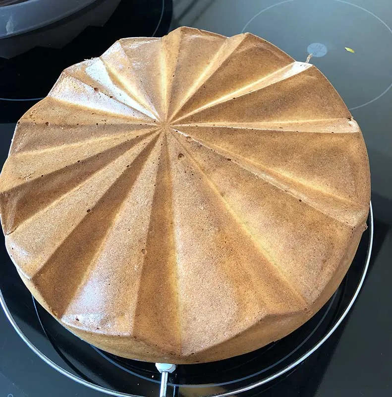 - Den fertigen Kuchen 10 Minuten in der Form lassen und dann zum Auskühlen auf ein Kuchengitter stürzen. Hilfreich ist es den Kuchen so zu stürzen, dass die Pfeilmarkierung auf 12 Uhr steht! Nach dem vollständigen Auskühlen weiter verarbeiten!