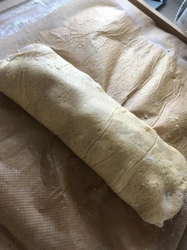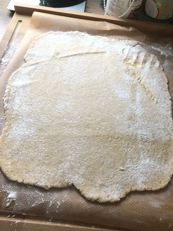 - Mit feuchten Händen den Teig zu einer Kugel formen und auf das Backpapier geben. Mir Bambusfaser bemehlen und etwas flach drücken. Mit der Teigrolle rechteckig ausrollen. Siehe Bilder unten!