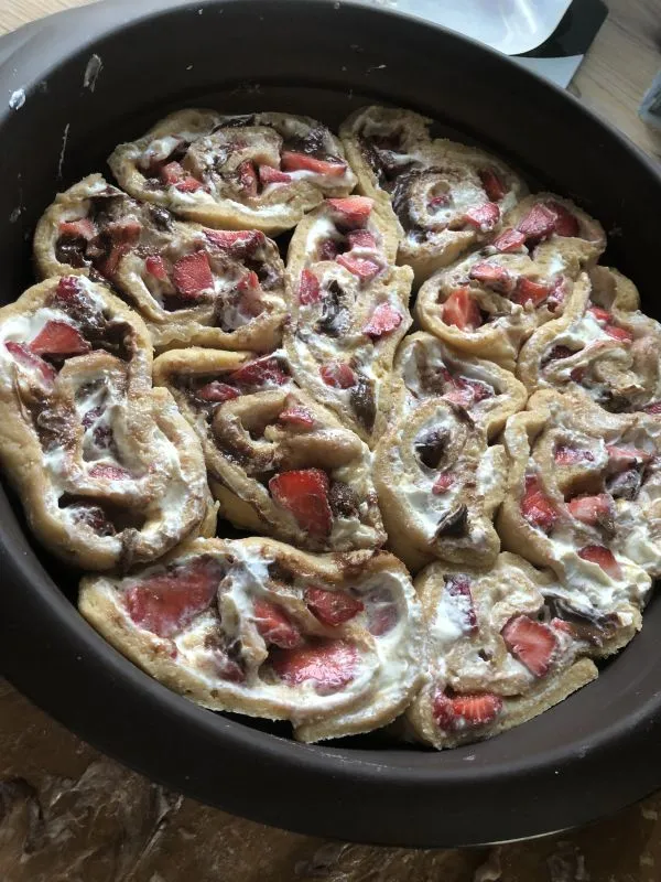 Leckerer Kuchen aus Briocheteig mit Erdbeeren, Ricotta und etwas NUKETO - NUR 158kcal und 3g KH pro Stück!