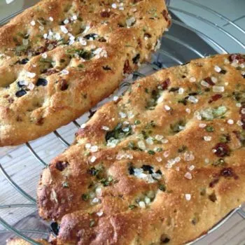 Herrliches Focaccia mit getrockneten Tomaten, Oliven, frischen Kräutern und Meersalz! Super zum Grillen und als Snack zwischendurch!