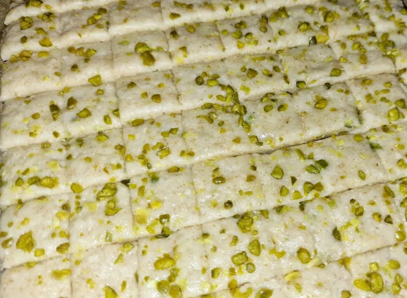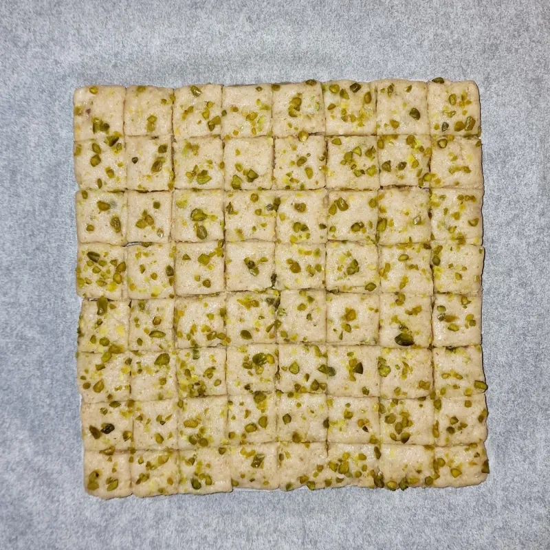 - Teig zwischen zwei Blatt Backpapier zu einem Quadrat ca. 18 x 18 cm ausrollen. Backpapier vorsichtig abziehen, mit nassen Fingern glatt streichen und mit einer Teigkarte, sehr tiefe Linien quer - und längs einstechen, die dann zu kleinen Quadraten werden. Dann die restlichen Pistazien aufstreuen.