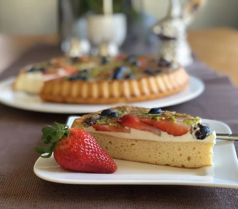 Der Boden ist ein der Erdbeerzeit mein Lieblingskuchen, allerdings nur mit Erdbeeren, ohne Tortenguss, ohne Pistazien und statt Sahne Kokosjoghurt/-Milch echter Vanille für die Panna Cotta 😋
