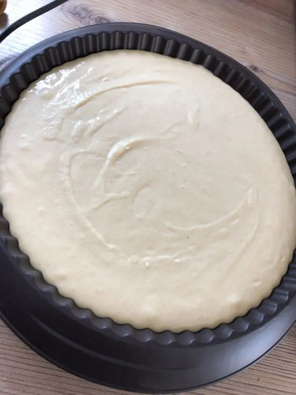 - Die Eier mit Sahne, Quark, Aroma und Kuchenzauber verrühren. Den Teig ca. 5 Minuten ruhen lassen und erneut verrühren.