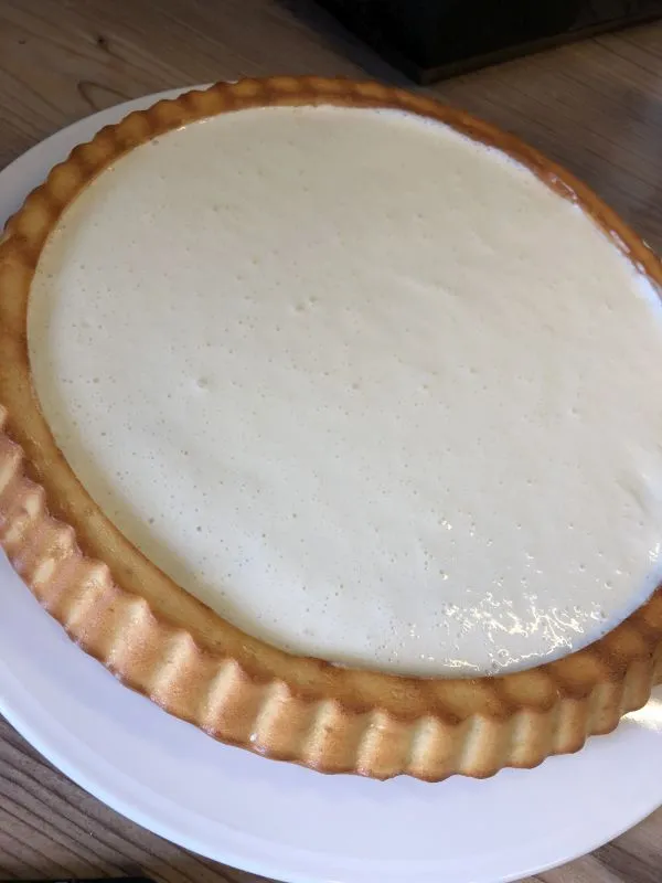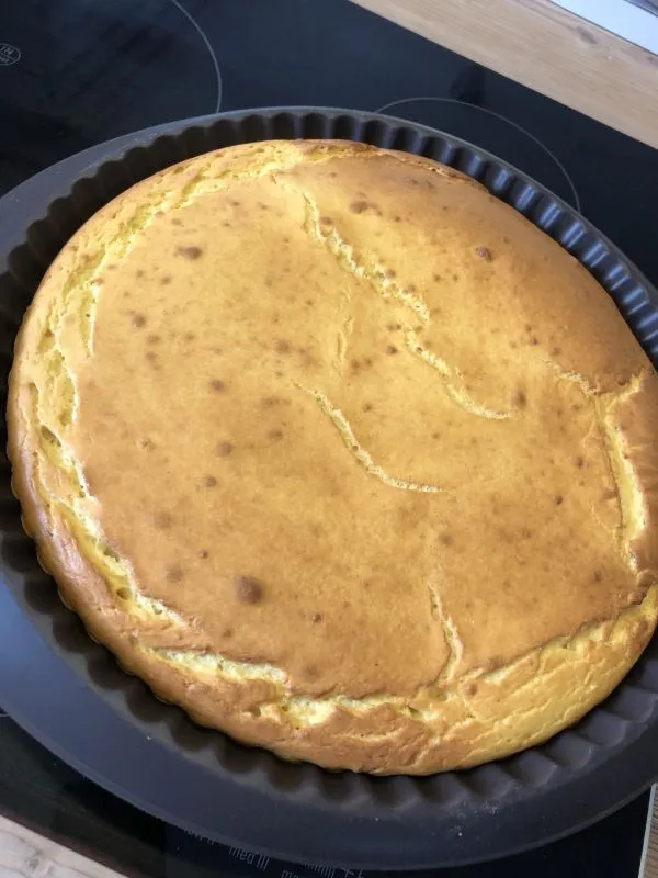 - Für die Panna Cotta die Sahne kurz aufkochen, Gelatinepulver, Joghurt, Süsse und Aroma nach Wahl einrühren. Auf dem Kuchenboden verteilen (siehe Bild unten in Galerie). Den Kuchen incl. Panna-Cotta-Spiegel etwas im Kühlschrank abkühlen lassen.
