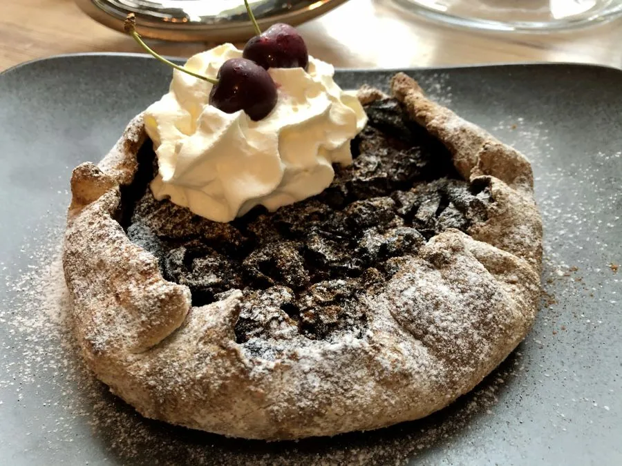 • Die Creme auf die Teigplatte geben - etwas Rand freilassen. Kirschen oder andere Früchte darauf geben. Die Ränder einschlagen.