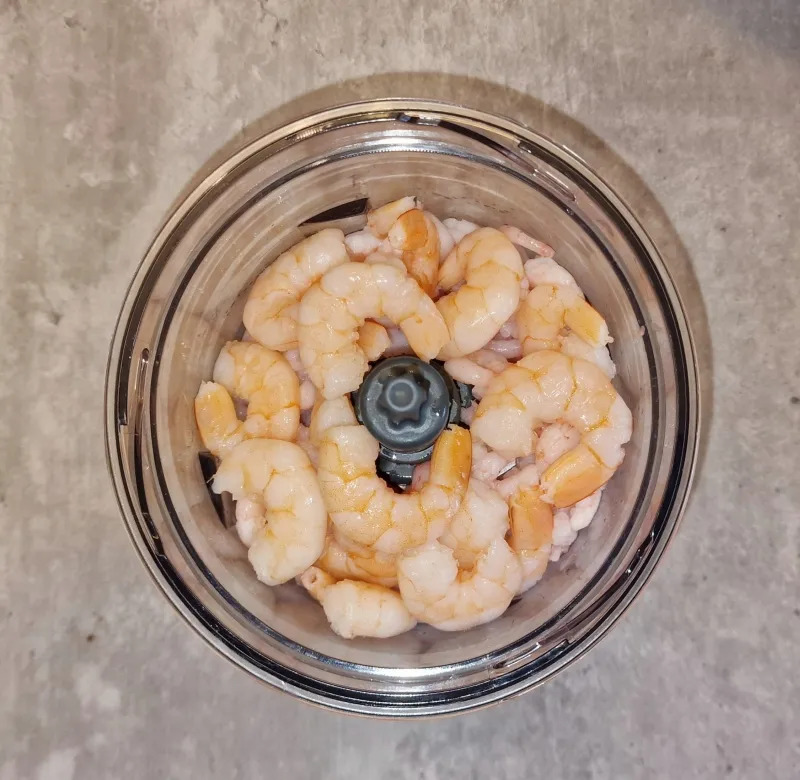 - Die Garnelen in einem Multizerkleinerer fein zerkleinern und in eine Schüssel füllen.