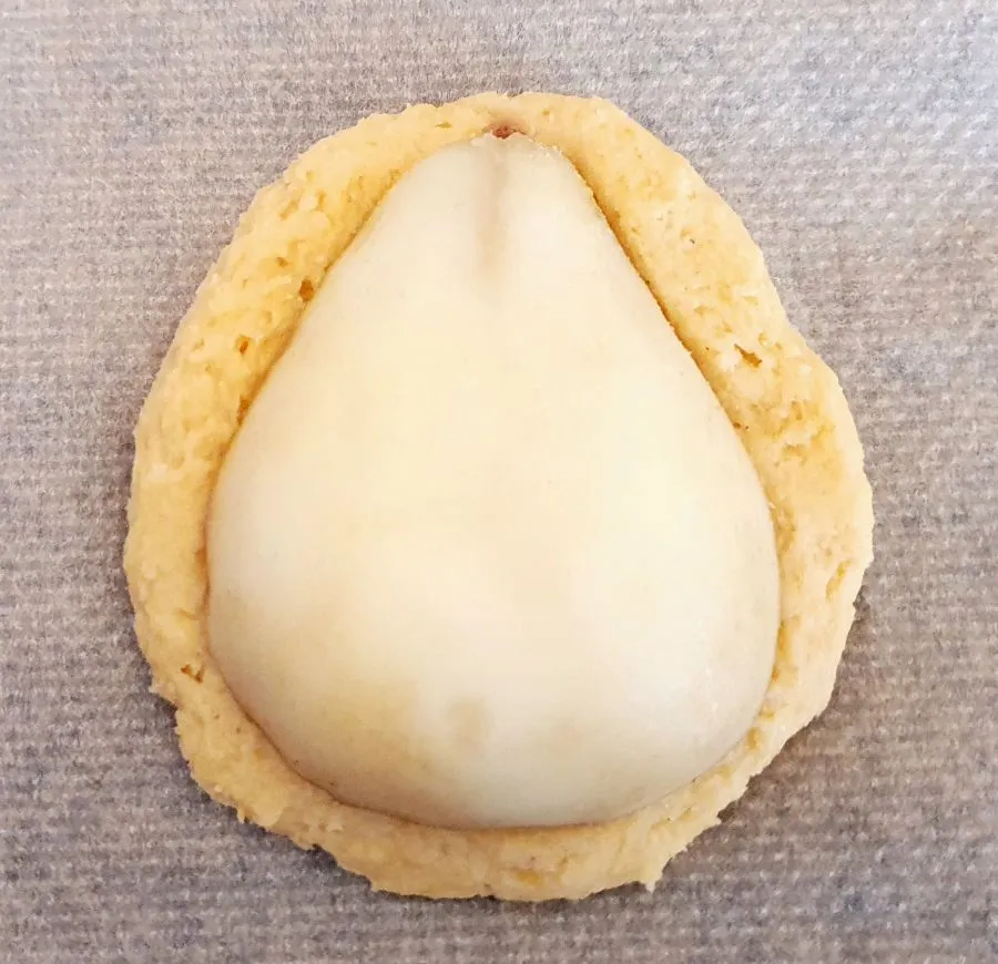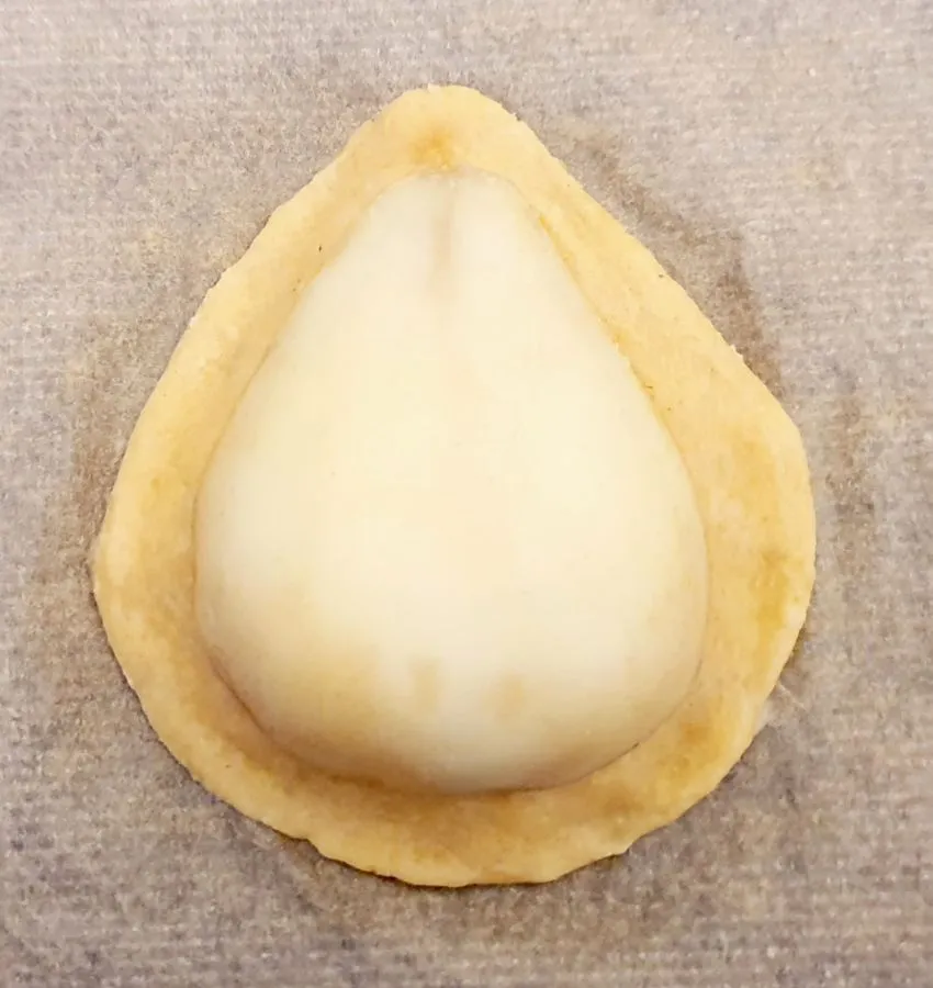 - Den übrigen Teig für Stiel und Blatt zur Seite legen. Mit nassen Finger den Rand an die Birne legen und glatt streichen.