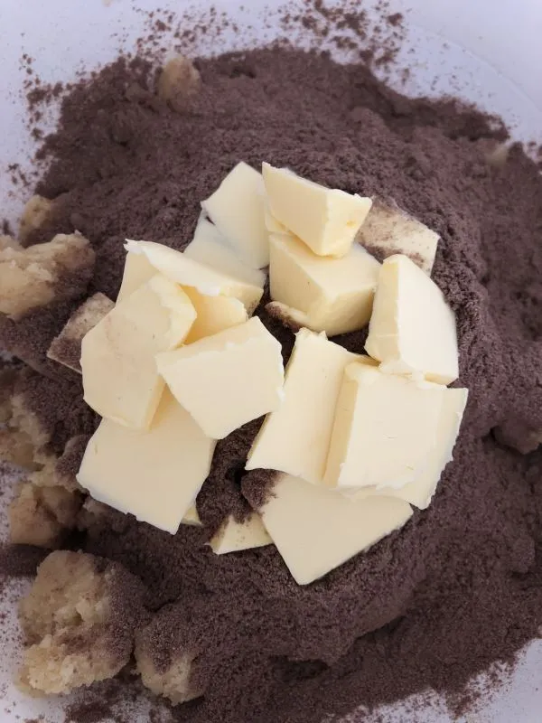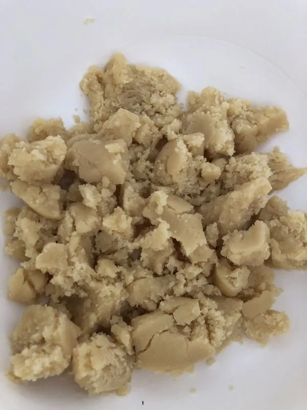 - Die Kakaobutter schmelzen und mit Rosenwasser und Aroma verrühren und zur Mandelmischung geben.