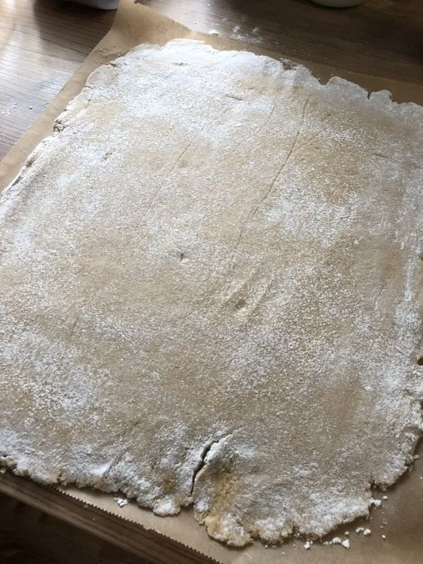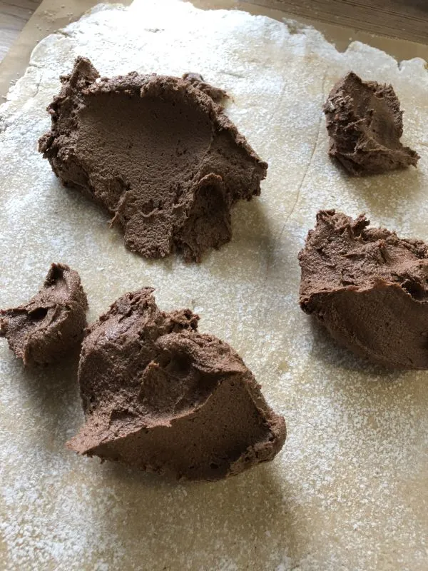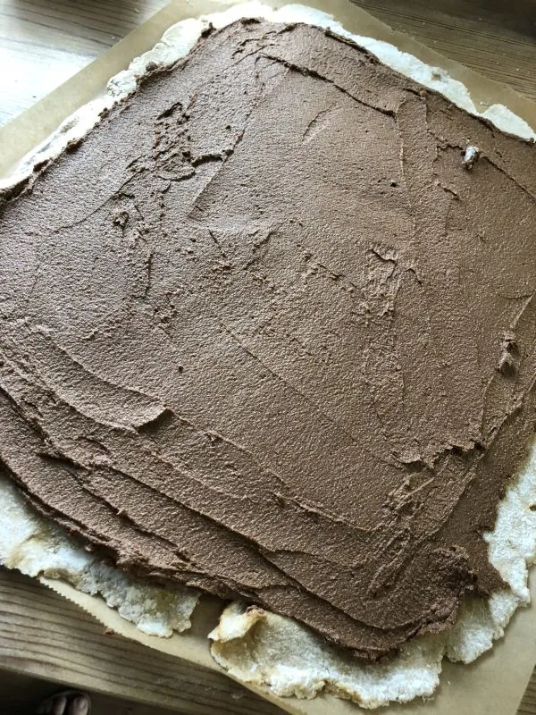 - Teig auf mit Bambusfaser bemehltem Backpapier oder Arbeitsfläche zu einem kleinen Rechteck formen und zu einem etwa 40 x 30 cm großen Rechteck ausrollen. Die Füllung darauf verteilen und verstreichen.