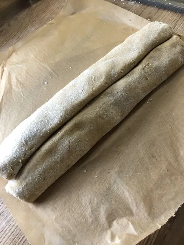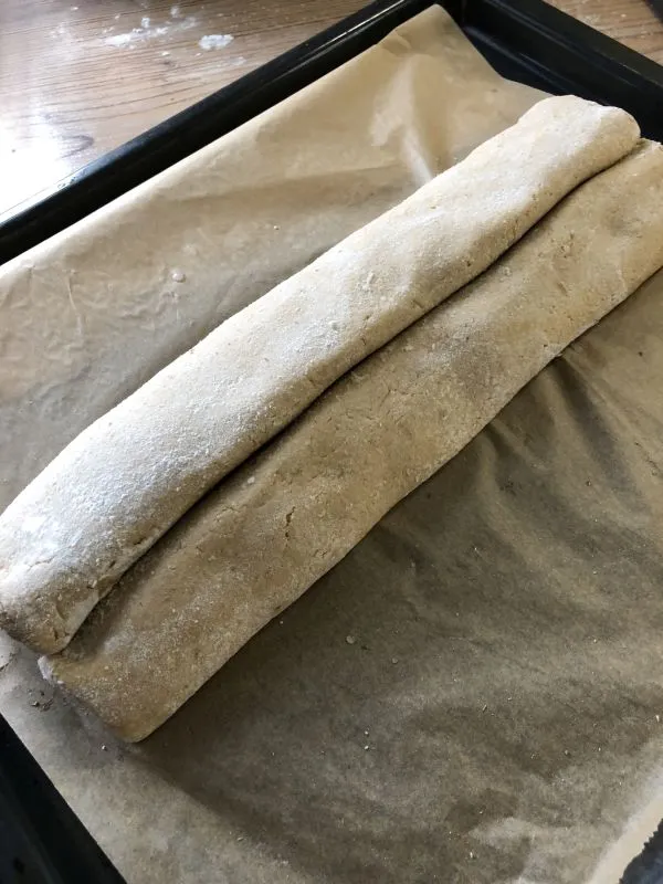 - Teig von den kurzen Seiten zur Mitte hin aufrollen und auf ein Backblech legen.