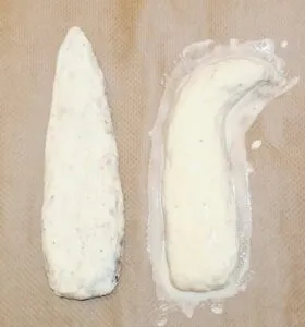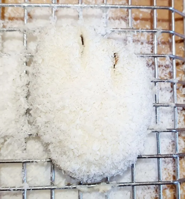 • Am nächsten Tag die Teile fertig machen. Dafür den restlichen Schokoladenzauber schmelzen und etwas eindicken lassen. Die Teile vom Backpapier lösen und die Ränder - sollten Nasen sein, mit einem Messer vorsichtig glätten. Die Teile dann wieder mit geschmolzener Schokolade dick einpinseln und mit Kokosflocken großzügig umhüllen. Mit dem Hinterteil eines Esslöffel oder Gabel am Rand die Kokosflocken festdrücken. Danach wieder in den Kühlschrank oder TK zum fest werden stellen.