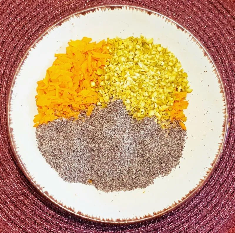 • In der Zwischenzeit Karotten schälen und grob raspeln, Pistazien hacken - falls erforderlich, Mohnfix abwiegen und alle drei Zutaten miteinander vermengen.