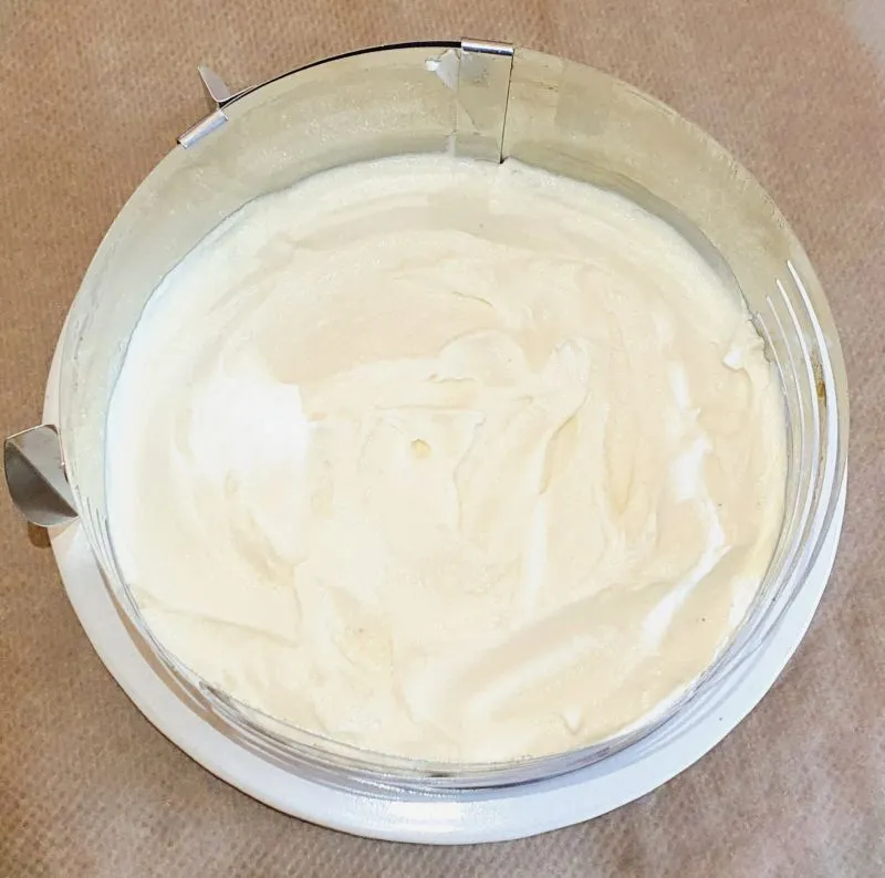 • Eine Tortenring vorbereiten und den ersten Boden einlegen. Mit Marmelade bestreichen, etwas Creme verteilen und einen Boden draufsetzen. Den Boden wieder mit Marmelade bestreichen und mit der Creme wiederholen. Den letzten Boden aufsetzen und sollte noch etwas Creme über sein, oben drauf streichen. Mit Frischhaltefolie abdecken und über Nacht in den Kühlschrank stellen.