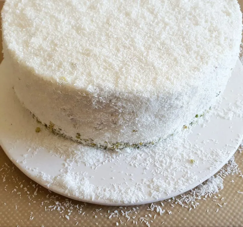 • Die Torte aus dem Tortenring nehmen und mit der Frischkäsecreme einstreichen. Mit Kokosflocken einstreuen.