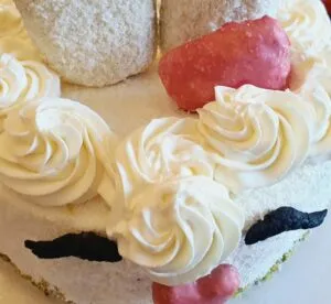 • Mit der weißen Creme oben auf der Torte mittelgroße Kreise aufspritzen. Dann die Ohren mittig aufsetzen. Damit die Ohren nicht nach hinten kippen, hab ich hinter den Ohren je 1 größere Erdbeere versteckt, die etwas dagegen hält, sollten die Ohren kippen. Die Schleife vor die Ohren setzen und zuletzt die Pfoten (meine sind a bissl zu groß geraten).