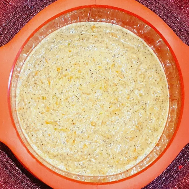 • Nach dem Rasten des Teiges, die Karottenmischung mit einem Löffel unter den Teig rühren. Zuletzt die geschmolzene Butter zum Teig geben und verrühren.