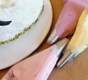 • Dann mit der eingefärbten Creme verschieden große Tupfen aufspritzen. Mit gehackten Pistazien bestreuen und mit Blüten verzieren.