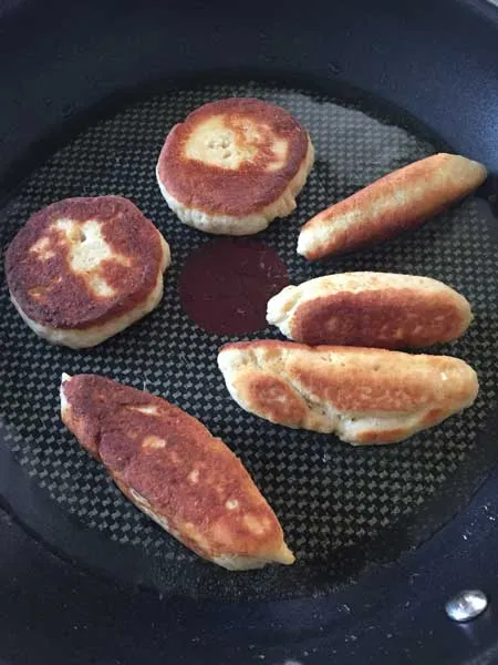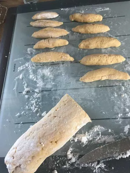 - Aus dem Teig auf mit Bambusfaser "bemehlter" Fläche und mit Bambusfaser"bemehlten" Händen eine Rolle machen, Stücke runterschneiden und "Fingernudeln" oder "Plätzchen " formen.