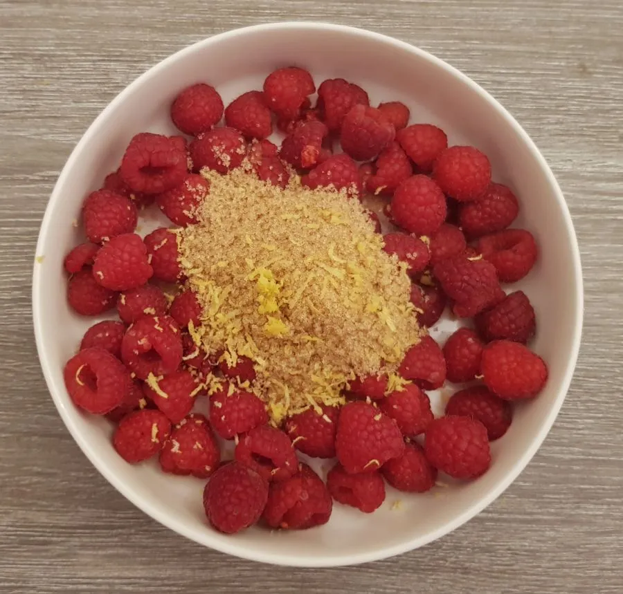 - Karamelltraum in einem Topf schmelzen lassen, Himbeeren und Schale der Zitronen hinzufügen und unter Rühren aufkochen.