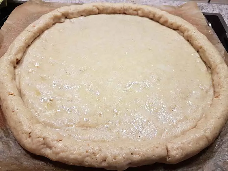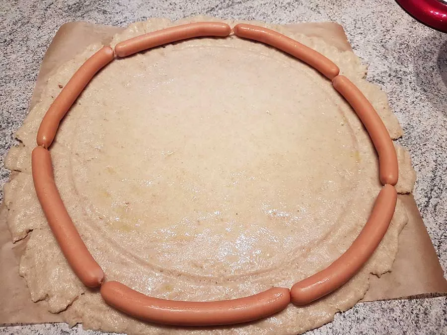 Rezept HotDog Pizza mit Würstchenrand und Senf-Dip glutenfreie lowcarb