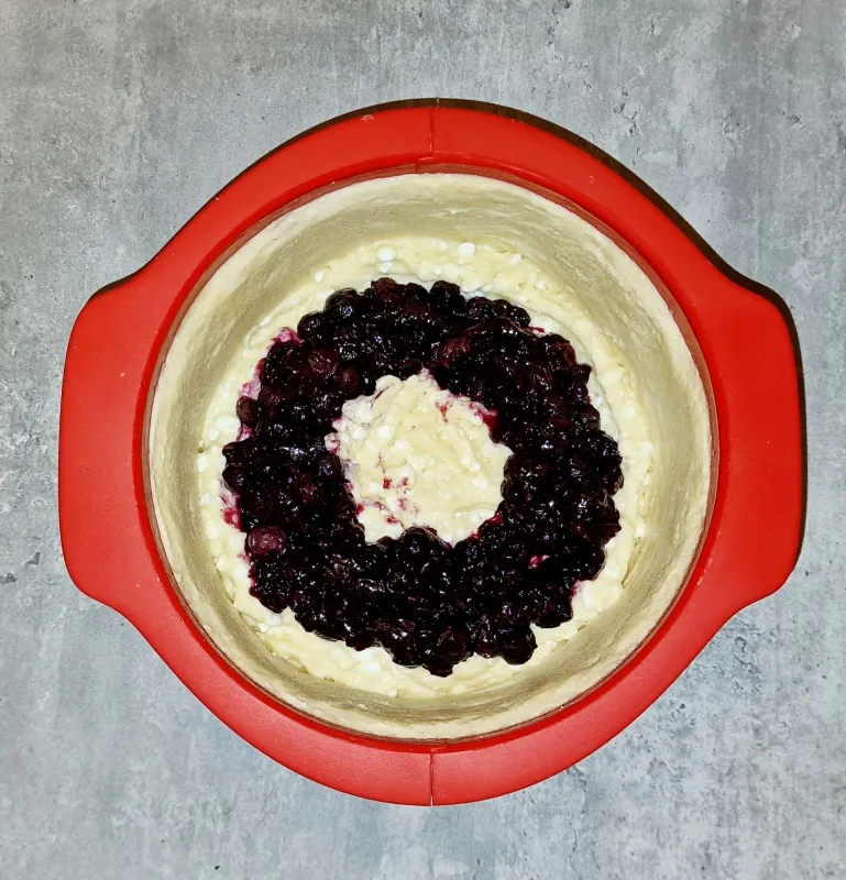 - Erst eine Schicht Hüttenkäsemischung, dann Blaubeercreme (wobei ich da mittig ausgespart habe, dann wieder Hüttekäsemischung, Blaubeeren und zuletzt mit dem Rest der Hüttenkäsemischung abschließen. Backform auf die Tischkante klopfen, so dass die Luft rausgeht und dann backen.