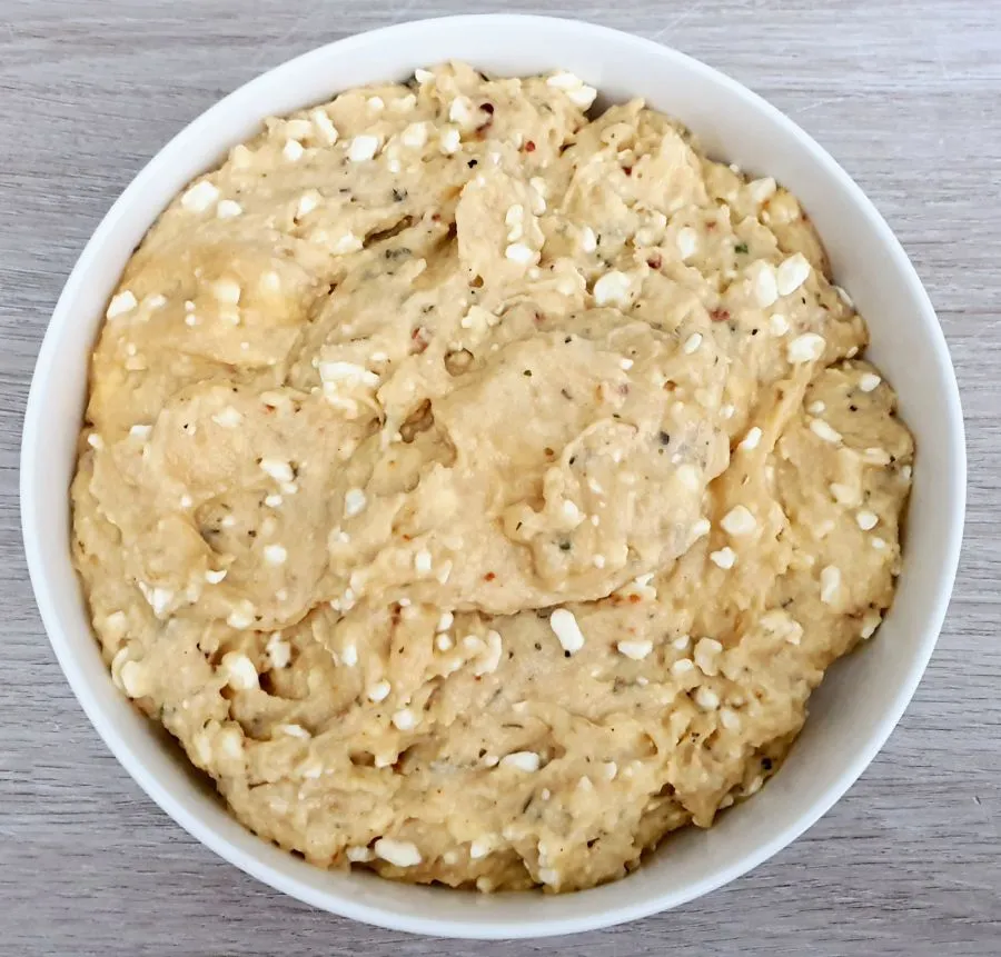 • Dann gings weiter mit 1. Schicht. Butter schmelzen. Die Eier schaumig rühren, Milch, Butter, Gewürze hinzufügen und glatt rühren. Dann Mandelteig und Mandelstaub unter die Masse rühren. Zum Schluss den Hüttenkäse unterrühren. Salzen und pfeffern nach eigenem Geschmack, Teig kosten obs so passt.