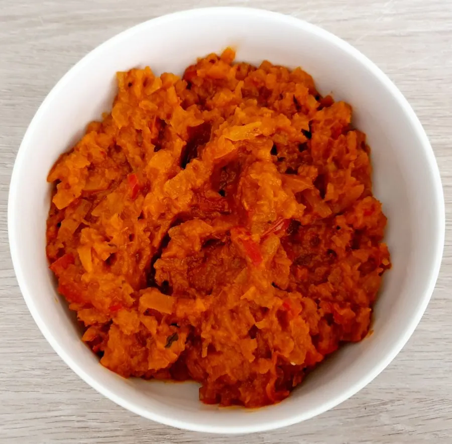 • Ich hab mit der zweiten Schicht begonnen, weil das Letscho ja etwas abkühlen muss. Zwiebel, Paprika und Tomaten schneiden. Kürbis grob reiben. Ghee in einer Pfanne schmelzen, Zwiebel und Paprika anbraten. Kürbis und Tomaten hinzufügen und auch anbraten. Dann mit Rinderbrühe aufgießen, Gewürze hinzufügen und langsam köcheln lassen, bis die Flüssigkeit verkocht ist. Dauert ca.20 Minuten - in eine Schüssel füllen und abkühlen lassen.