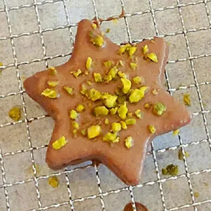 - Wenn alle Plätzchen gefüllt sind, den Schokoladenzauber schmelzen. Die Sterne mit Schokolade überziehen, die Schokolade etwas anziehen lassen, und dann mit gehackten Pistazien bestreuen.