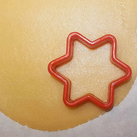 - Marzipan durchkneten und zwischen 2 Lagen Backpapier auf 3mm Stärke ausrollen. Die Marzipanplatte wenn möglich im Eisfach fest werden lassen, ansonsten im freien oder Kühlschrank, da dauerts länger. So lässt es sich leichter ausstechen. Mit dem Sternaustecher Sterne ausstechen.