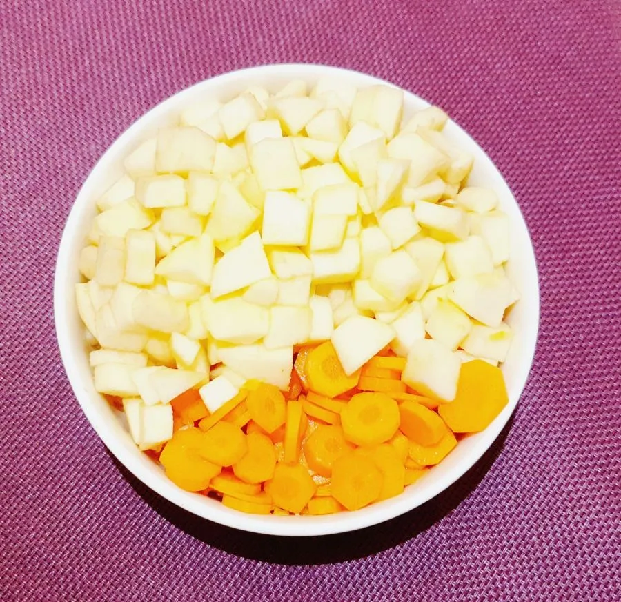 - Apfel schälen und klein würfeln, Karotten putzen und grob reiben.