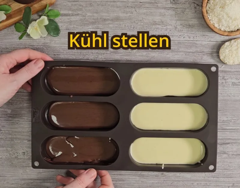 - Schokoladenzauber schmelzen und in eine Silikonform geben. Wir haben dazu die Lurch Flexiform Hotdog Bun Form verwendet. Ihr könnt natürlich auch kleinere Formen verwenden. Menge des Schokoladenzaubers an Form anpassen. Wir haben hier je Sorte ca. 100g verwendet. Kommt auch darauf an, wie dick Ihr die Schichten macht.