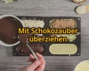 - Wenn die Masse durchgekühlt ist, mit Schokoladenzauber überziehen.