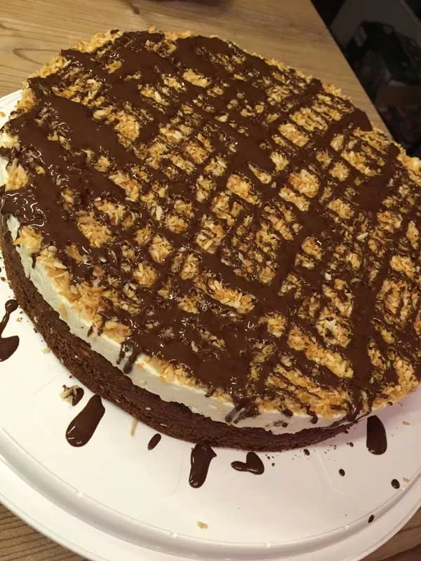 • Die Kokosraspel in einer Pfanne mit dem Erythritol karamellisieren. Abkühlen lassen und auf der Torte verteilen.