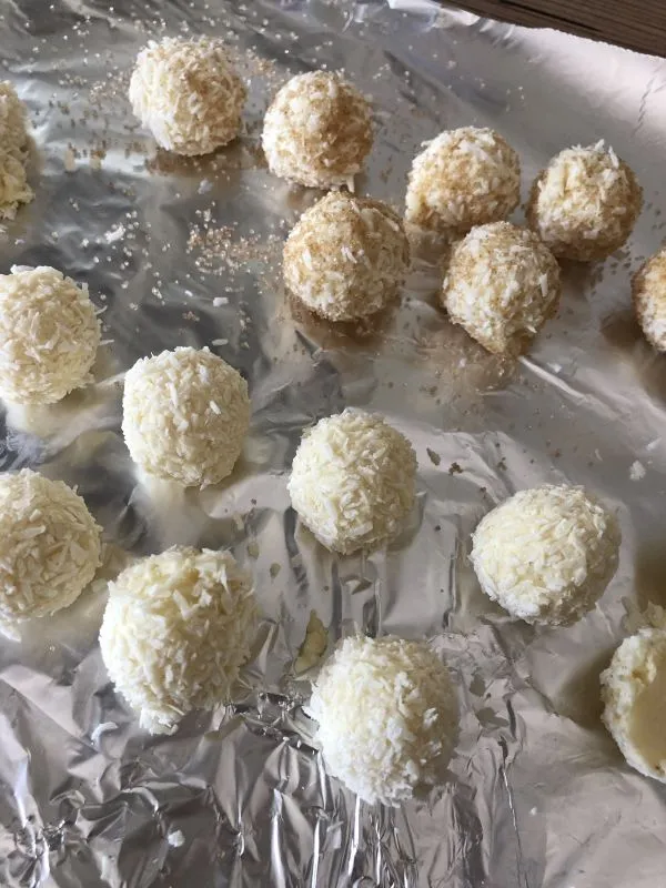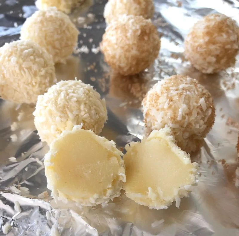 Pralinen mit einer Fülle aus Sahne, weißer Schokolade und Kokosmus! Ein Traum für jeden Fan der runden weißen Kugeln aus dem Handel, der die gesündere Variante naschen will! NUR 1g KH pro Stück.