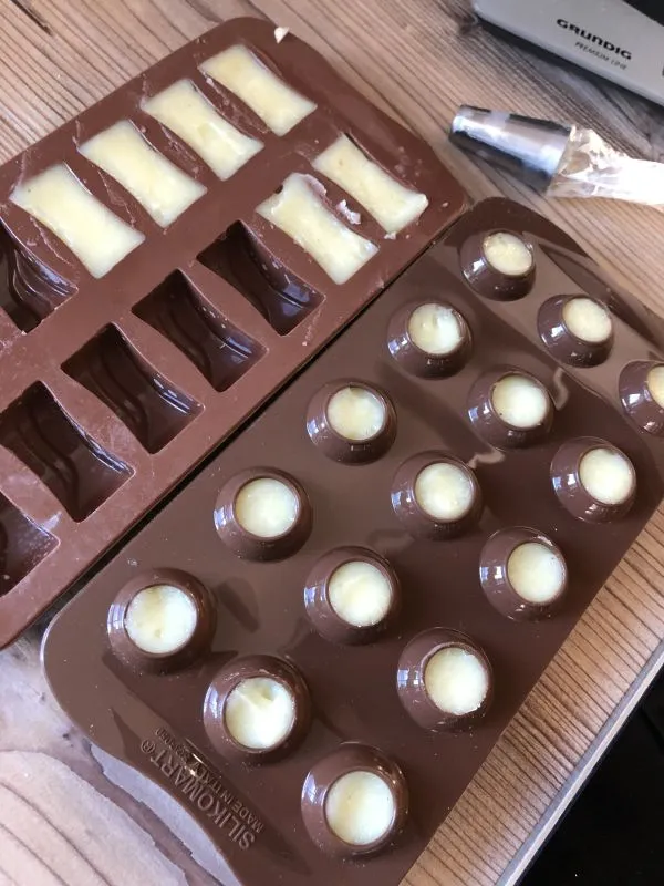 • Die Füllung in die Kugelformen spritzen und optional eine Mandel reindrücken (man kann auch halbierte Mandeln nehmen und einfach mit Kakaobutter zusammenkleben)! Im Kühlschrank gut durchkühlen lassen. Nach dem Kühlen aus der Form drücken und bis zur Weiterverarbeitung im Kühlschrank aufbewahren.