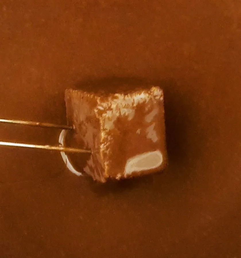 • Mit einer Pralinengabel immer 4 Würfel in den Schmelztopf legen und gut 5 Minuten (geht länger auch), in der Schokotunke ziehen lassen. Mit einer Pralinengabel aufspießen und abtropfen lassen.