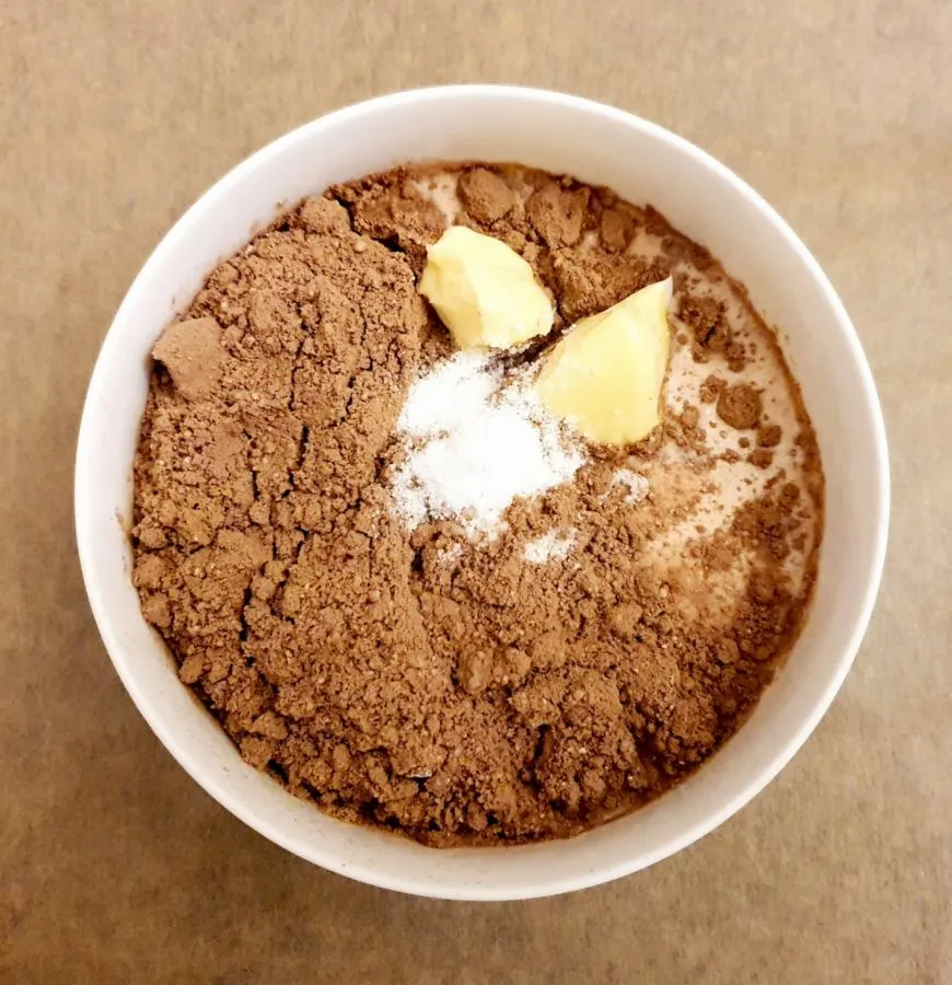 • In der Zwischenzeit einen Topf mit Wasser vorbereiten und erhitzen. In einen Schmelztopf Schokoladenzauber, Butter, Milch, Kakao, Low Carb Süße und Rum füllen.