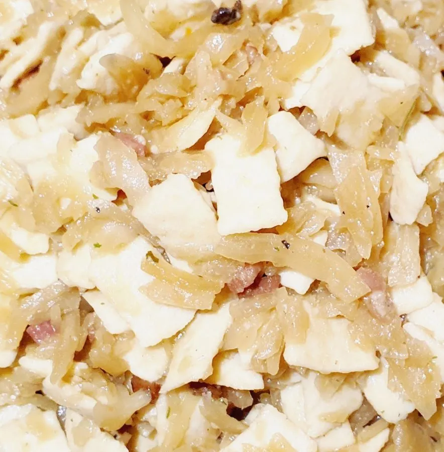Krautfleckerl mit Speck und Zwiebeln. Pro Portion NUR 2g Kohlenhydrate.