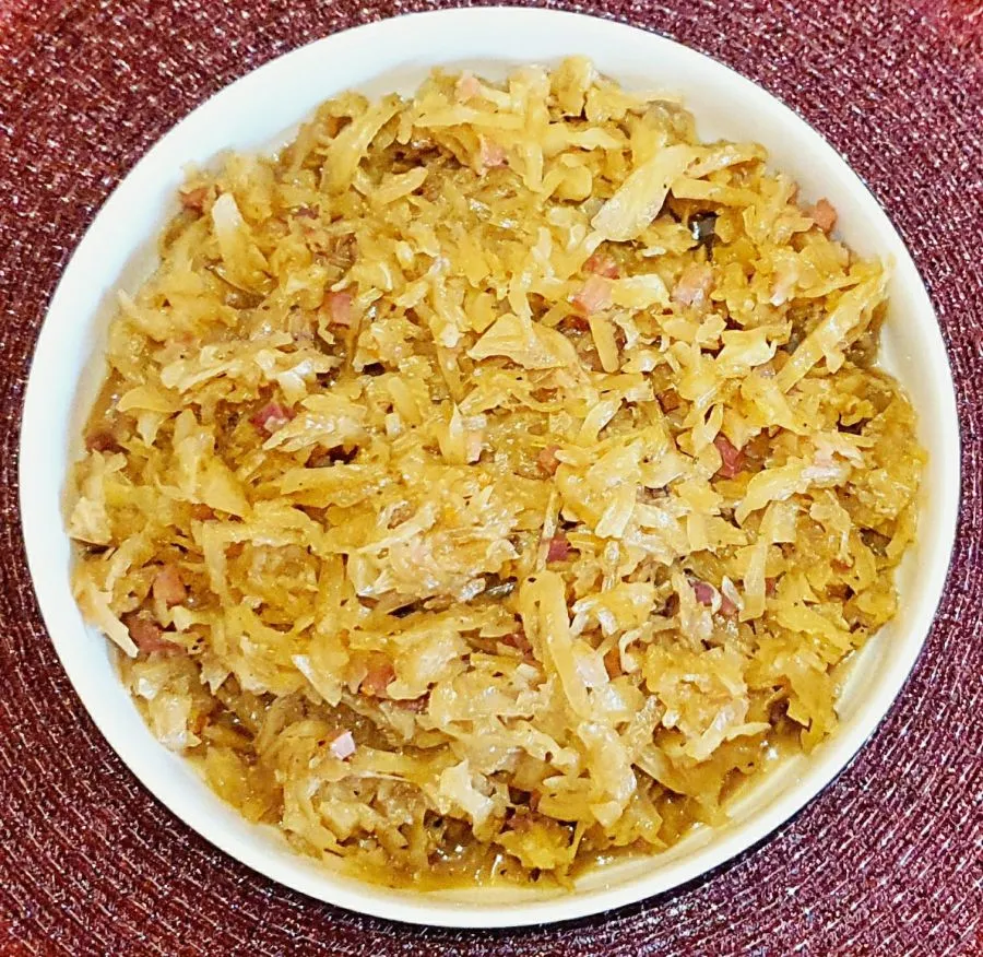- In einem großen Topf Ghee und Karamelltraum erhitzen, Zwiebel und Speck leicht andünsten. Kraut ausdrücken, in den Topf geben und anrösten.